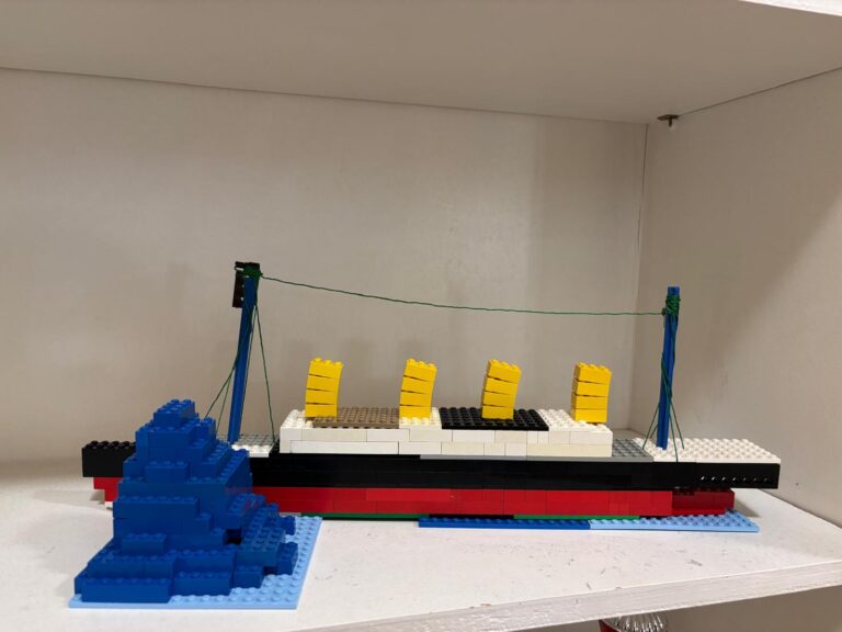Hier wurde die Titanic samt Eisberg aus LEGO-Steinen gebaut. Damit alle Kinder das Werk bewundern können, wird es in unserer Glasvitrine ausgestellt.
